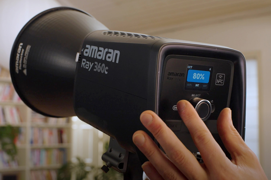 Aputure Amaran Ray 360c hỗ trợ điều khiển trực tiếp trên thân đèn thông qua màn hình TFT và núm FlowTurn, mang lại cảm giác điều chỉnh chính xác và trực quan. Ngoài ra, thiết bị làm video này còn cho phép kết nối nhanh với ứng dụng amaran qua NFC, điều khiển Bluetooth với phạm vi lên đến 80m. Đối với studio chuyên nghiệp, Ray 360C có thể mở rộng điều khiển DMX qua USB-C (thông qua adapter tùy chọn), phù hợp với các hệ thống ánh sáng nhiều đèn.