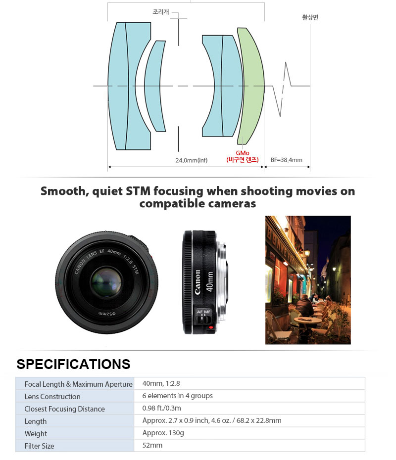 STM là chức năng tự động lấy nét yên tĩnh, mịn và liên tục trong quá trình quay video. Khẩu độ tròn được hình thành bởi 7 lá màng kết hợp với khẩu độ rộng có thể cung cấp cho bạn bokeh đẹp - khu vực nền out-of-tập trung hình ảnh của bạn. Ống kính Canon EF 40mm f/2.8 STM này sẽ cung cấp cho bạn một cái nhìn tương đương ống kính 64mm khi được sử dụng trên một máy ảnh với một bộ cảm biến APS-C, và có thể tập trung gần như là 11,81". Nếu bạn đang tìm kiếm một ống kính "bình thường", đây là một nơi tốt để bắt đầu.