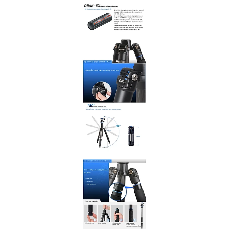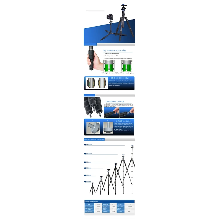Các chân có ổ khóa xoắn cho sự ổn định tối đa, với một trong những chân có thể tháo rời để kết hợp với cột trung tâm để tạo ra một monopod.