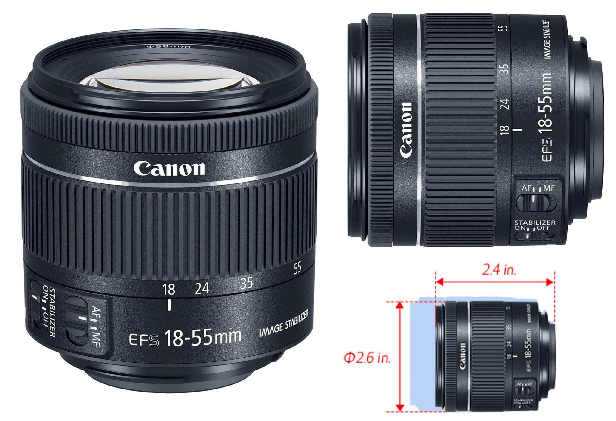 Bên cạnh 2 chiếc DSLR dùng cảm biến APS-C mới ra mắt, Canon cũng giới thiệu ống kit EF-S 18-55mm F4-5.6 IS STM mới với kích thước nhỏ hơn 20% so với phiên bản cũ. Để đạt được sự thu nhỏ này, Canon đã phải hy sinh 1/3 stop ánh sáng. Ống kính này vẫn được trang bị motor lấy nét STM và hệ thống chống rung quang học với mức mức độ chông rung 4 stop. Khoảng cách lấy nét của ống kính vẫn giữ mức 0.25m, trọng lượng 215gr và dùng filter đường kính 58mm. Giá bán lẻ của ống kính này không thay đổi, vẫn là $250, xấp xỉ 5,7 triệu đồng.
