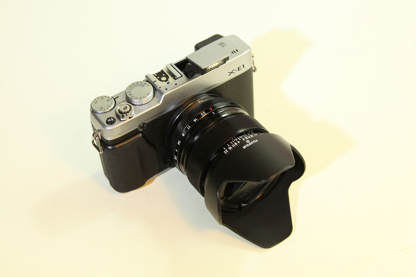 X-E1 ấn tượng với cái nhìn đầu tiên với thiết kế chắc chắn, và đầy tinh tế,. Ở kích cỡ gần tương tự FUJIFILM X100, X-E1 là mẫu máy compact mới mẻ và trọng lượng nhẹ (chỉ 350g). Với hai phiên bản màu bạc và màu đen, hoàn hảo cho những người muốn có một cái nhìn hoài cổ, tươi mới, để nhấn mạnh phong cách riêng của họ, và phiên bản màu đen chắc chắn cho các nhà nhiếp ảnh muốn hòa trộn vào môi trường xung quanh mà không gây nên sự chú ý về các đối tượng của họ.