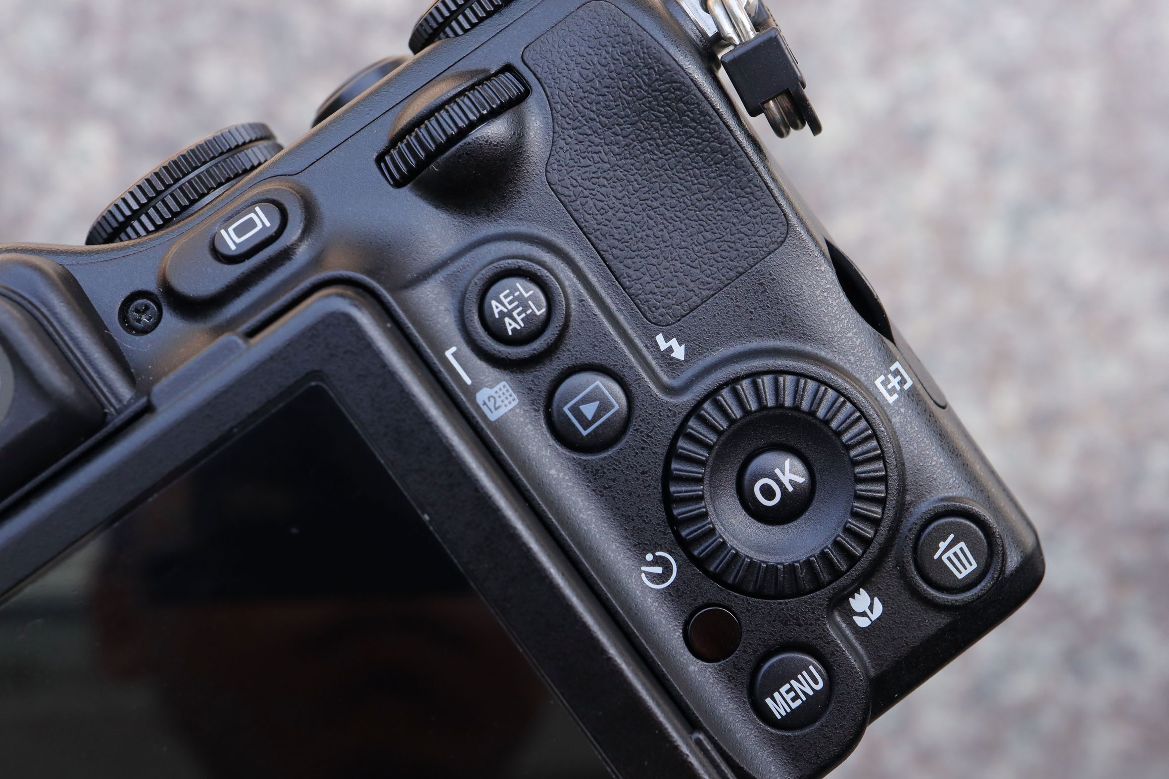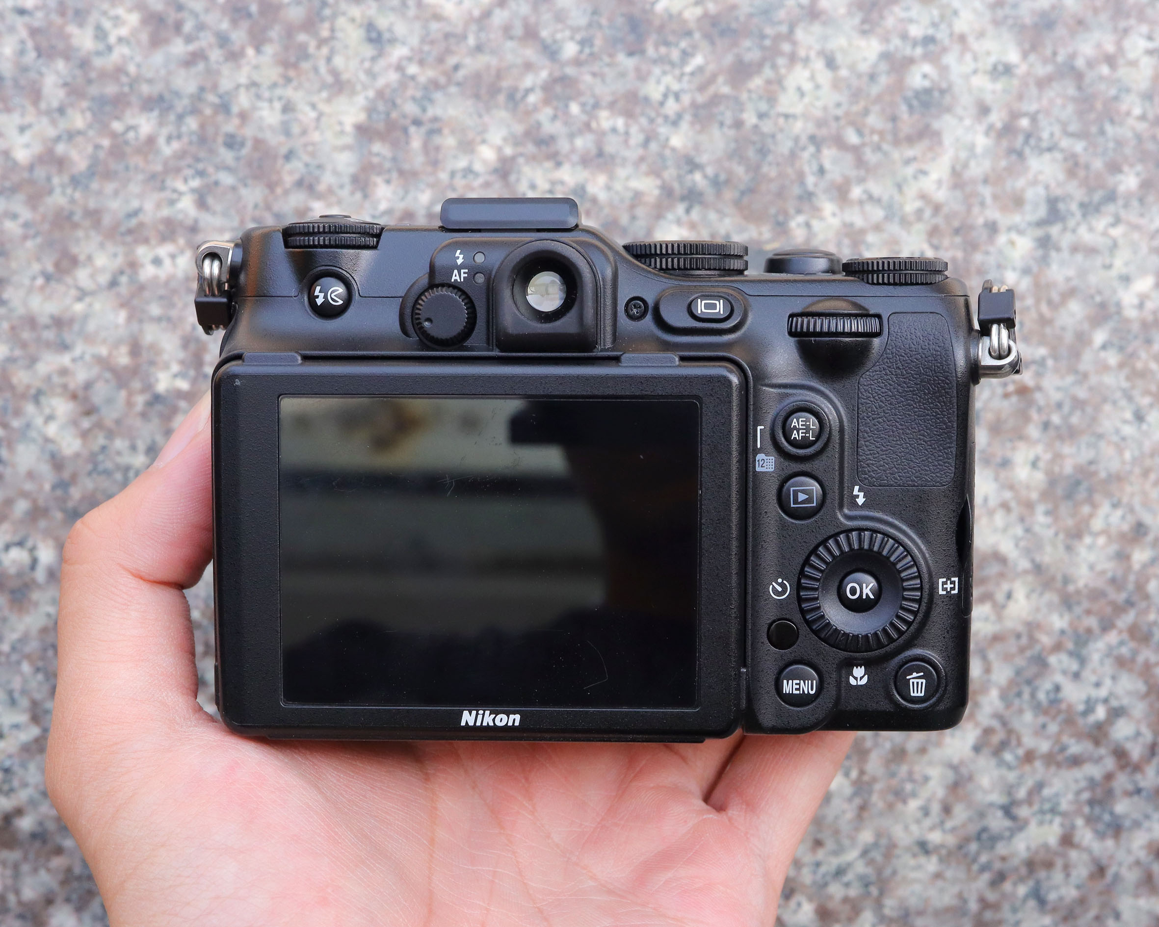 Mặt sau, ở phía bên trái là một nút có biểu tượng trò chơi pac-man khá quen thuộc. Đây là nút bật flash tích hợp sẵn trong máy. Phía bên phải là nút xoay Control, nút khóa sáng/khóa nét AE/AF lock, nút Display, Playback, nút OK nằm trong vòng xoay giúp dễ dàng chỉnh các thông số và thiết lập khác. Ở ngay phía trên Menu là nút hồng ngoại, cho phép bạn dùng remote để chụp từ xa.. Cuối cùng là nút Delete ở ngoài cùng bên phải. Nikon P7000 còn được trang bị kính ngắm quang học, sự riêng biệt quang học so với ống kính, nên có thể sẽ không chính xác khi chụp một đối tượng quá gần. Kính ngắm quang sẽ giúp tiết kiệm pin và trong những điều kiện ánh sáng bạn khó khăn khi sử dùng màn LCD để chụp.