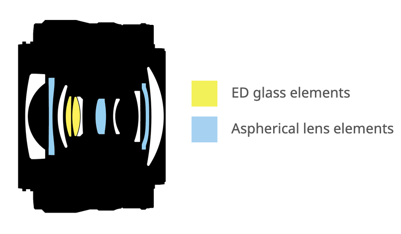 Ba thấu kính phi cầu có tác dụng giảm hiện tượng cầu sai, méo hình, tăng độ sắc nét và tính chính xác của chủ thể, của hình ảnh trong khung hình. Hai thấu kính phân tán cực thấp giúp giảm tình trạng quang sai màu và viền màu, cho hình ảnh hiển thị sống động với độ tương phản về màu sắc cao hơn.