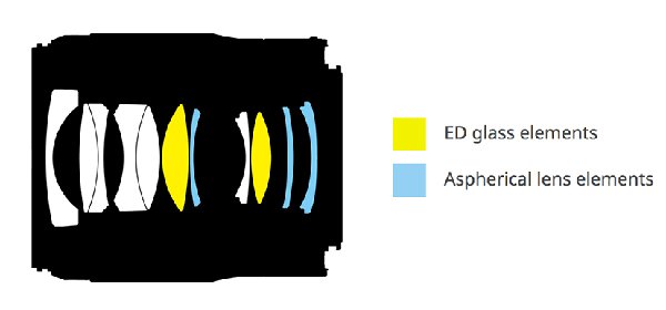 Hai thấu kính tán sắc cực thấp ED thực hiện chức năng giảm hiện tượng quang sai màu và viền màu, cải thiện độ tương phản về màu sắc để hình ảnh hiển thị trung thực và sống động hơn. Ba thấu kính phi cầu có tác dụng giảm cầu sai, méo hình, giúp hình ảnh chụp được chính xác nhất, sắc nét nhất và không bị sai lệch về hình dạng.