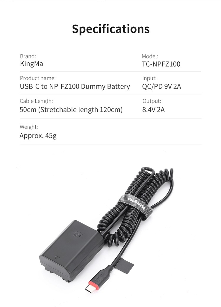 Kingma USB-C to Sony NP-FZ100 dummy battery