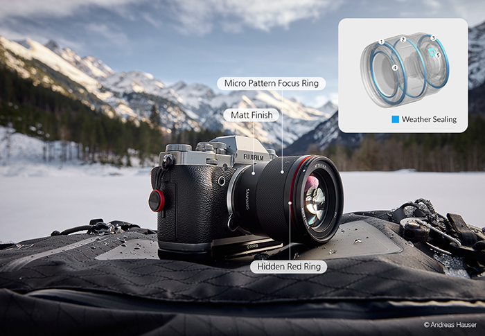 Ống kính có trọng lượng nhẹ chỉ 230g và có một kích thước nhỏ gọn 65mm x 69mm, sử dụng filter đường kính 58mm cho phép bạn sử dụng nó ở khắp mọi nơi, thay đổi bộ lọc dễ dàng hơn để phù hợp với mục đích chụp ảnh. Đây có thể được xem là ống kính tele lấy nét tự động nhỏ và nhẹ nhất hiện nay dành cho người dùng Fujifilm X. Đặc biệt với thiết kế thế hệ thứ hai, Samyang đem đến các lớp đệm cao su bao quanh vòng lấy nét và bề mặt ống kính nhám cho trải nghiệm thao tác tốt hơn. Ống kính còn có khả năng chống chịu thời tiết với 5 vị trí niêm phong.
