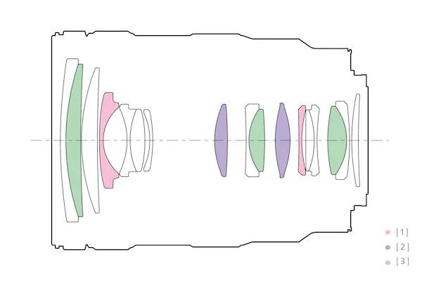 Thiết kế quang học của thấu kính bao gồm bốn thấu kính phi cầu, trong đó có hai thấu kính AA (Advanced Aspherical) giúp giảm thiểu đáng kể hiện tượng méo hình và quang sai hình cầu cho hình ảnh với độ sắc nét cao. Bên cạnh đó, ba thấu kính phân tán cực thấp cũng được sử dụng trong thiết kế của ống kính để giảm viền màu và quang sai màu, cải thiện độ rõ nét và độ chính xác của màu sắc.