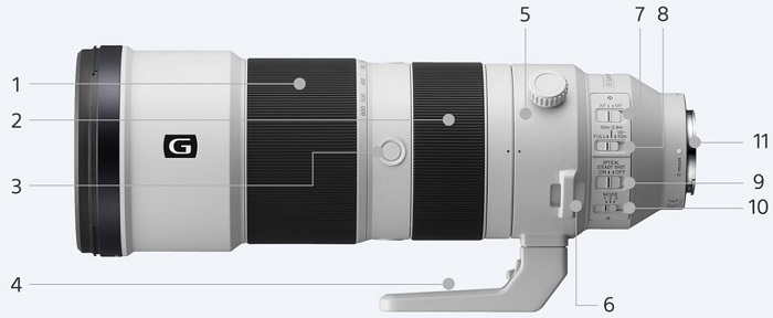 1. Vòng Zoom 2. Vòng lấy nét 3. Nút giữ điểm Focus 4. Tripod Mount 5. Tripod Colar Ring 6. Khoen dây đeo 7. Nút chuyển chế độ lấy nét 8. Giới hạn phạm vi lấy nét 9. Chuyển chế độ chống rung 10. Giới hạn chống rung 11. Thông số ống kính