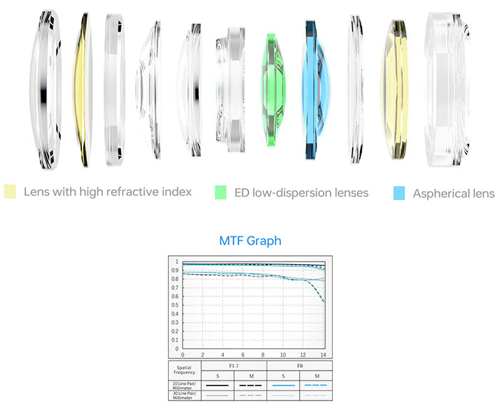 Trải nghiệm hình ảnh thuần khiết, sống động với công nghệ ống kính tiên tiến. Với 1 thấu kính tán sắc siêu thấp (ED), 1 thấu kính phi cầu và 2 thấu kính chiết suất cao (HR), ống kính này tăng cường độ sắc nét và rõ nét. Lớp phủ nano nhiều lớp giúp giảm hiện tượng lóa và bóng ma, đảm bảo màu sắc sống động, chân thực.