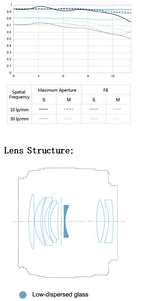 Về quang học, YN 50mm f/1.8S DA DSM bao gồm 8 thấu kính trong 7 nhóm. Trong đó, có 1 thấu kính tán xạ thấp làm nhiệm vụ giảm thiểu quang sai, gia tăng hơn nữa độ sắc nét cho bức ảnh. Dưới đây là bảng MTF về chất lượng quang học của YN 50mm f/1.8S DA DSM. Có thể thấy chất lượng quang học của ống kính này là “được” trong tầm giá, cho nhóm khách hàng phổ thông.