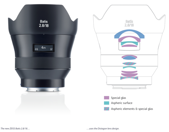 Ống kính Zeiss Batis 18mm F2.8 for Sony có cấu trúc quang học Zeiss Distagon nổi tiếng với 11 thấu kính gom thành 10 nhóm, trong đó có đến 4 thấu kính phi cầu kép (2 mặt phi cầu) và 7 thấu kính còn lại được làm từ loại thuỷ tinh đặc biệt. Cấu trúc quang học này cho phép Batis 18mm F/2.8 có thể lấy nét ở khoảng cách rất gần, chỉ 25cm. Ống kính này dĩ nhiên được trang bị lớp tráng phủ T* chất lượng cao nổi tiếng của Zeiss để loại bỏ ánh sáng xấu, các hiện tượng quang học không mong muốn và đồng thời đảm bảo chất lượng ánh sáng đi vào ống kính.